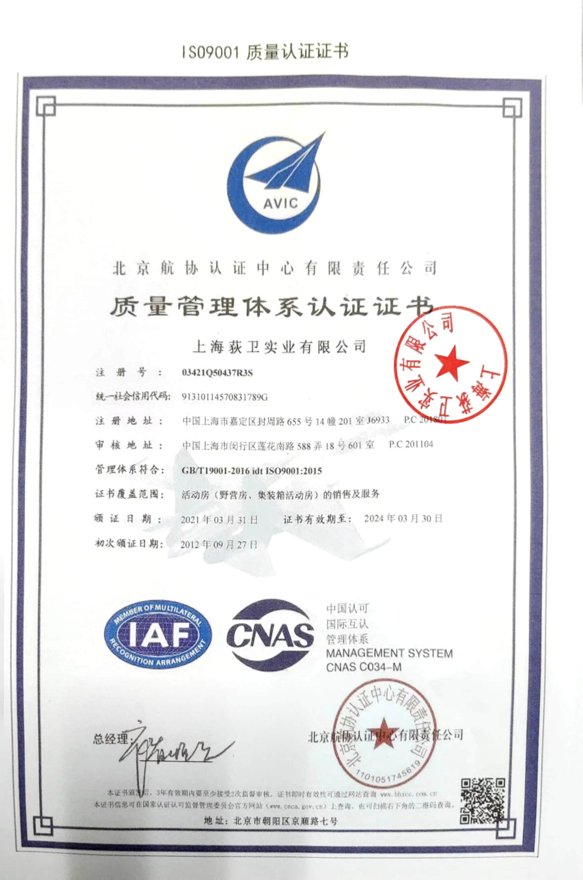 質量管理體係認證證書