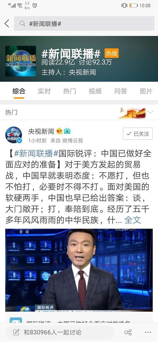 昨晚《新聞聯播》再次上了熱搜榜!而且一度直衝榜1位置!情況呢,是這麼個情況:昨天晚上,聯播主播康輝,鏗鏘有力地念了一段“國際銳評”,情狀如下:這段評論來自總台的“國際銳評”,主旨意思呢如標題所言:《國際銳評丨中國已做好全麵應對的準備》,其中,提到:對於美方發起的貿易戰,中國早就表明態度:不願打,但也不怕打,必要時不得不打。麵對美國的軟硬兩手,中國也早已給出答案:談,大門敞開;打,奉陪到底。經曆了5000多年風風雨雨的中華民族,什麼樣的陣勢沒見過?!在實現民族複興的偉大進程中,必然會有艱難險阻甚至...